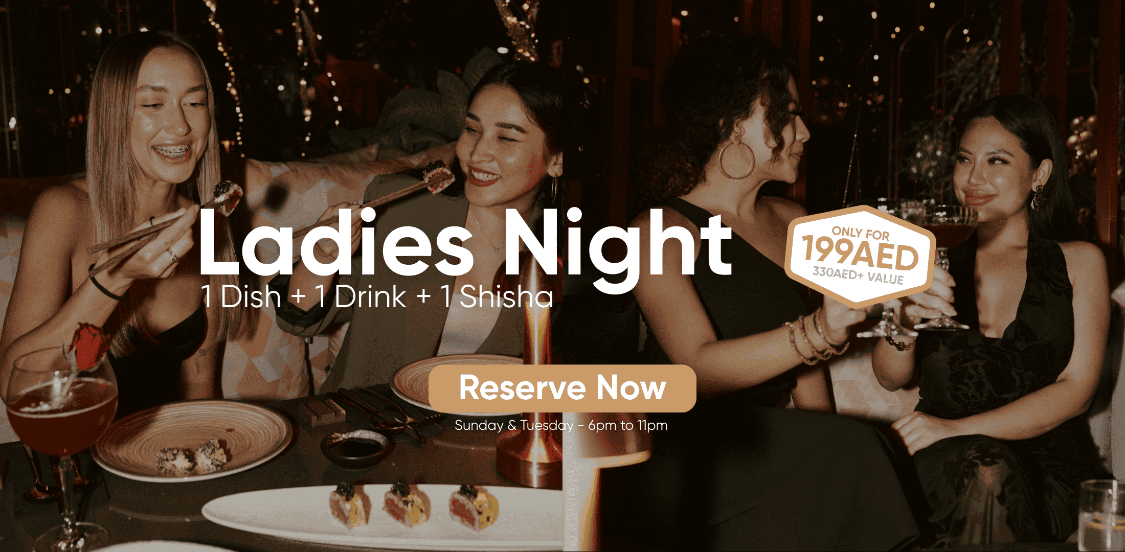 Every Tuesday and Sunday, enjoy 1 food item, 1 drink, and 1 shisha from the ladies night menu for just 199 AED!